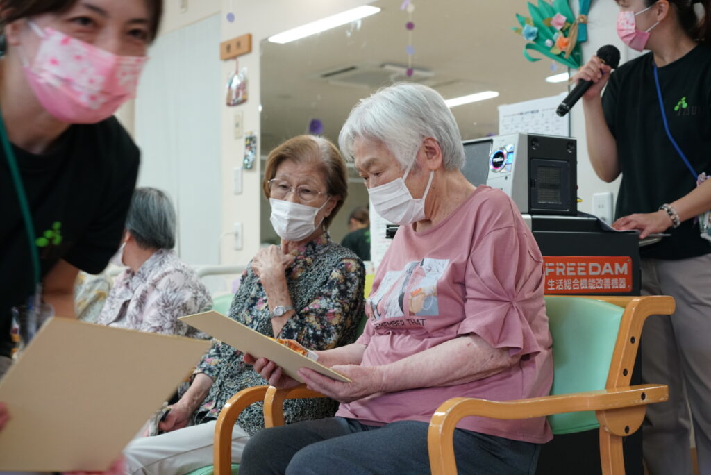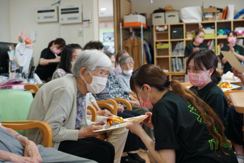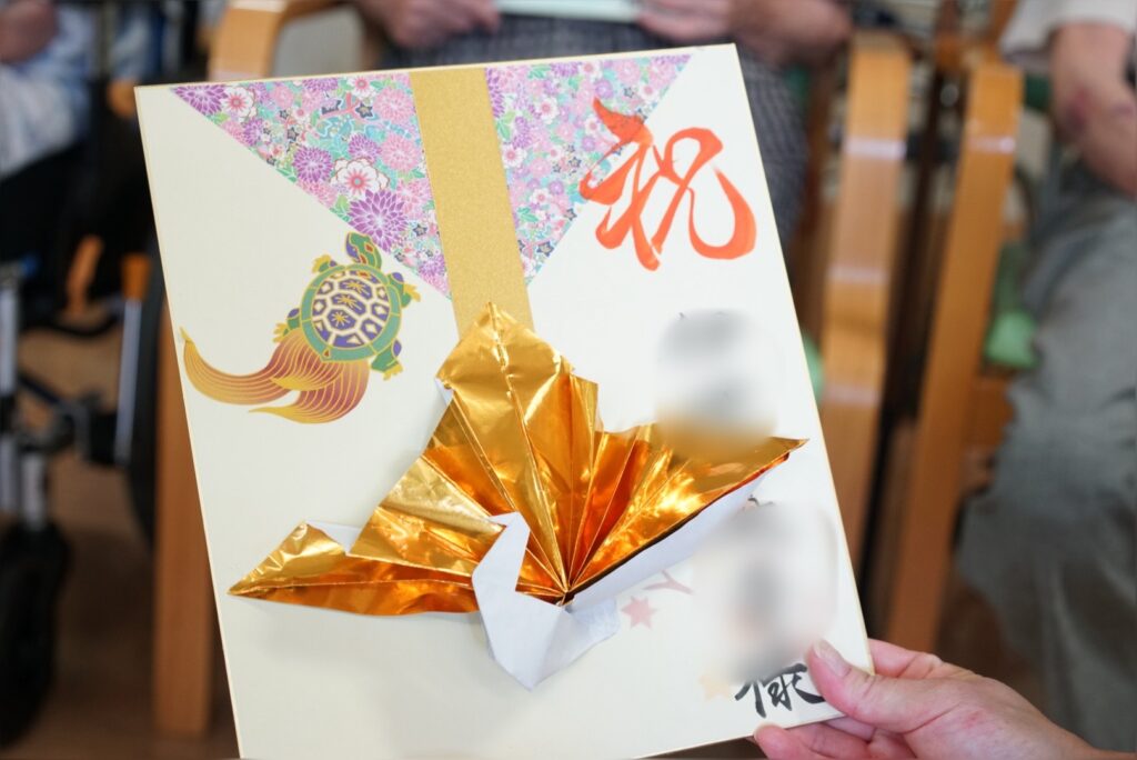 今年は施設をご利用いただいている90歳以上のご利用者様47名 の方々に、職員手作りの お祝い鶴がついた色紙 をプレゼント🎁✨